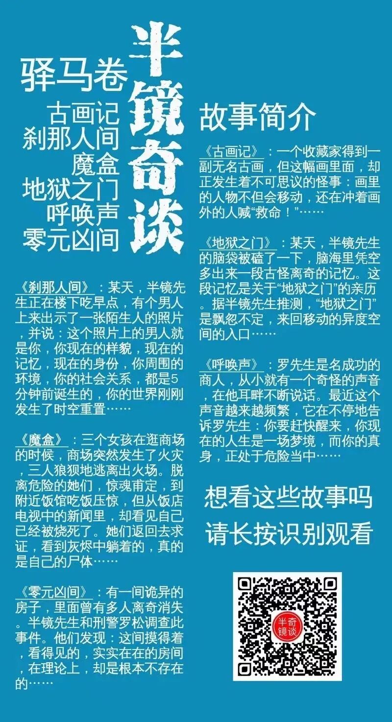 版权声明:本故事为半镜先生原创作品,已在国家版权部门版权备案,受国家法律保护。未经半镜先生书面许可,禁止以任何形式,从任何渠道复制,改编,演绎,和传播本作品。违者必依法追究。转发微信好友和朋友圈请随意。谢谢。