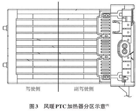 特斯拉空调箱系统采用风暖PTC进行乘员舱加热,PTC采用正温度因子材料随长度变化的加热管。可实现驾驶座与副驾驶座的分区加热控制,风暖PTC加热体横跨驾驶侧风道与副驾驶侧风道,如图3所示。