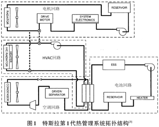 (1)特斯拉第1代热管理系统设计相对简单,各回路相对独立,乘员舱空调系统采用间接制冷方式,采用阀门控制可实现电机回路余热对乘员舱加热。