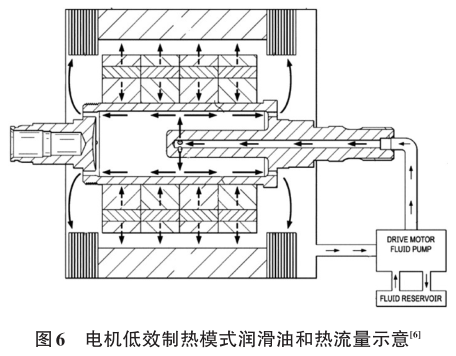 结合特别设计的电机润滑油流道,实现电机低效制热模式下的驱动电机热量转移,通过热交换器,把电机低效制热模式下生成的热量转移到电池回路,用于电池系统加热。电机低效制热模式可实现远大于电机普通驱动模式下的生热,因而可取消电池回路的高压PTC,节省系统成本。电机低效制热模式下的润滑油和热流量流动如图6所示。