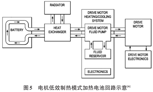 驱动电机采用油冷电机,与电机回路通过热交换器实现热量传递,同时电机新增低效制热模式,通过电机控制器新的控制方式,可实现电机发热模式,通过四通阀控制,实现与电池回路的串联,采用电机低效制热模式用于电池回路的加热,相应的取消电池回路的高压PTC,减少成本。采用电机低效制热模式对电池回路进行加热的运行如图5所示。