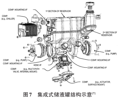 特斯拉采用集成式储液罐设计,实现膨胀水箱与热管理系统的加热与冷却部件高度集成,如图 7 所示。该集成模块可以包含四通阀、电机水泵、电池水泵、Chiller热交换器、散热器和执行器等部件,通过结构改进,减少不必要的热管理系统管路和接头连接数量,简化热管理系统在整车上的装配工作量,节省整车装配时间和后期维护成本。