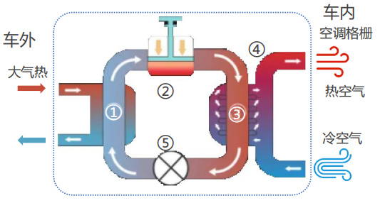 ③ 高温冷媒热与车内空气发生热交换,车内冷空气温度升高