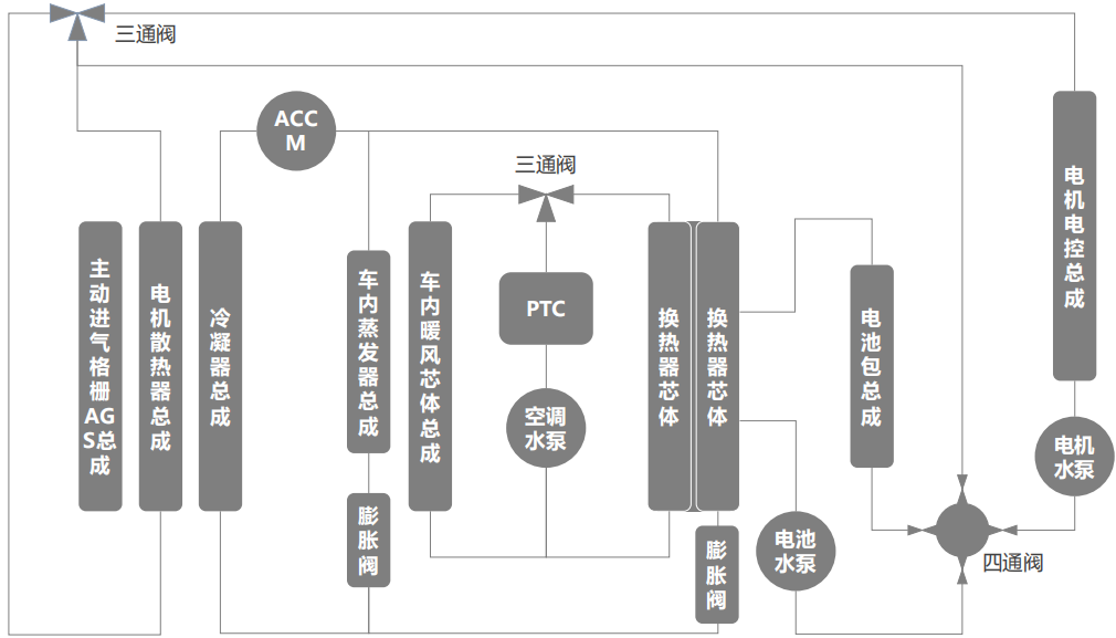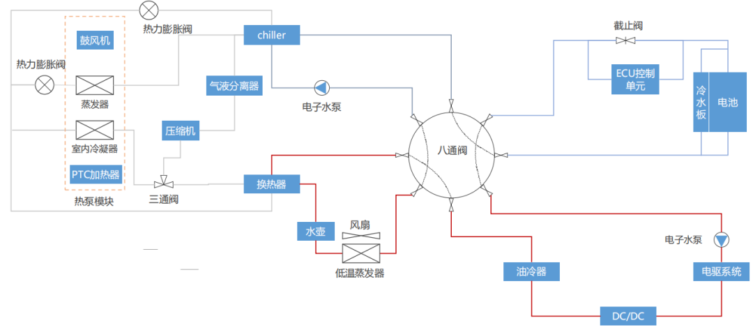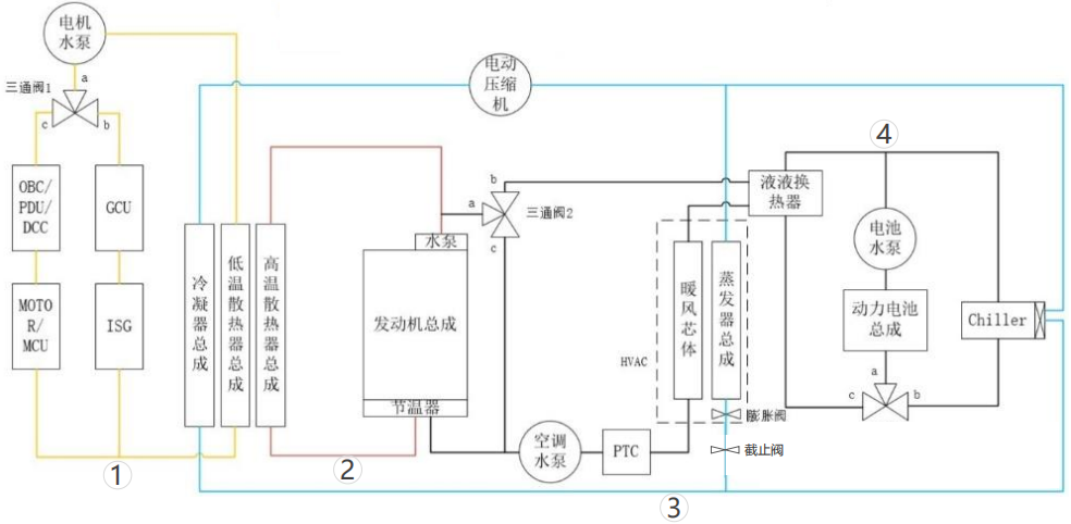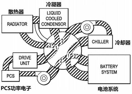 余热循环利用:利用一个四通阀,将电机冷却水路与电池温控水路串接,利用电机余热加热电池,降低系统能量损失。