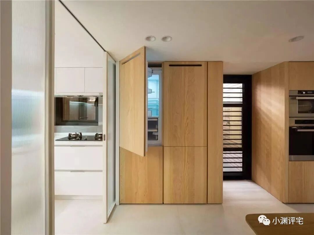 还不过瘾?可以看看更专业的隐藏式冰箱。这种冰箱对缝隙的要求更小,还可以直接放在柜子里。冰箱门外面,可以再贴一层木门。这样从外观看,柜子就完完全全是一个整体。其中的某一扇柜门,里面其实是冰箱。