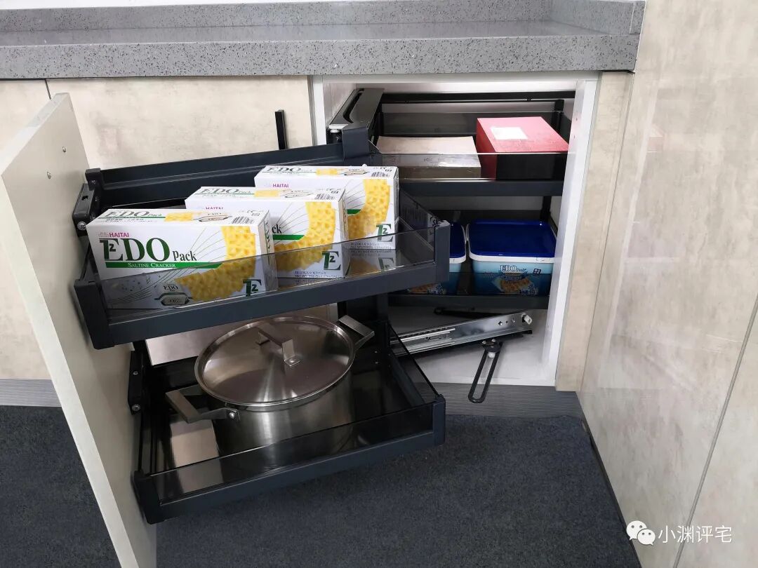 理想很美好:在橱柜里面安装金属拉篮,甚至是可以旋转、抽拉的拉篮。拉篮摆放更轻松,抽拉、旋转让我们使用时不必钻到橱柜里。