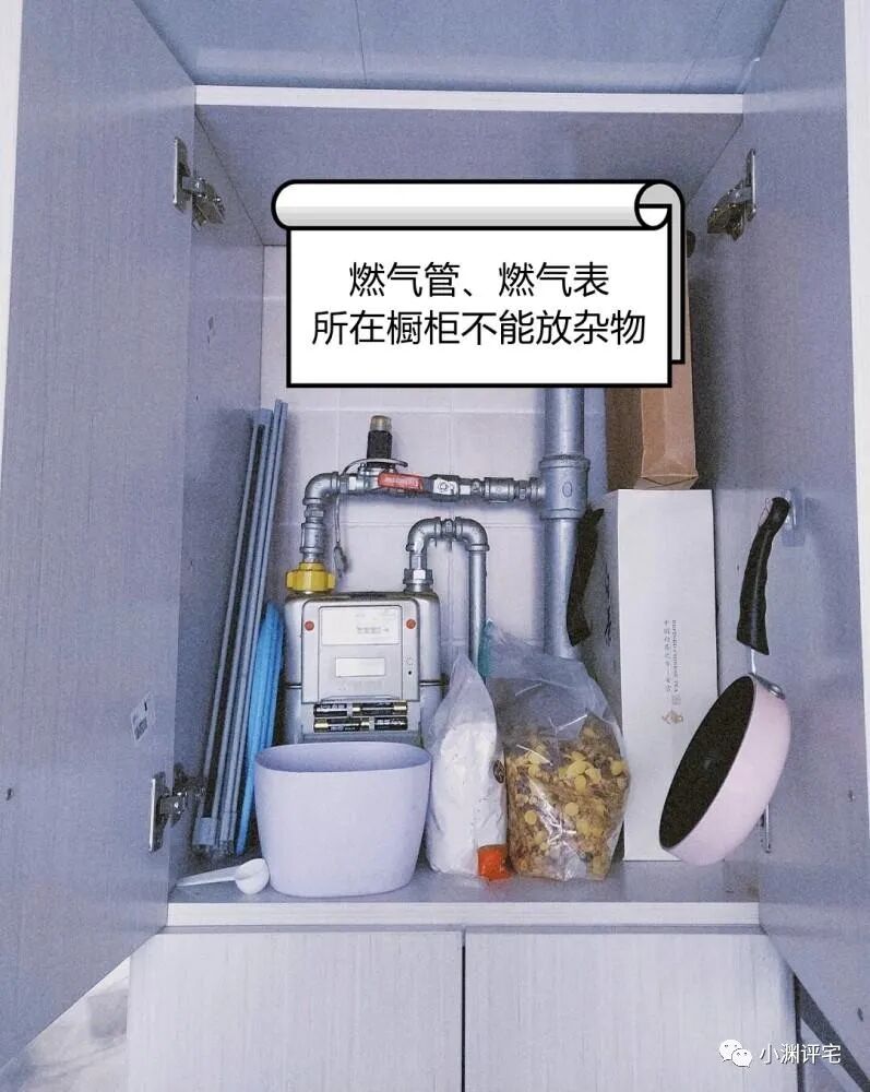 燃气验收标准中规定,天然气的管道、阀门、燃气表,都必须裸露在外,不能被橱柜等遮挡起来——如果包管了,就需要预留不小于150cm²的通风口。而且阀门、燃气表不能整个被包住,需要预留门或者检修口。