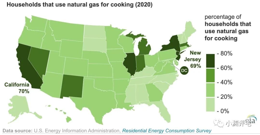 欧美国家,则更偏爱用电做饭。想想也能理解:他们的饮食比较简单,烤箱、电磁炉,就已经能够满足日常所需。2020年,美国的家庭天然气使用率只有30%,这还是因为一些州的使用率达到了80%。
