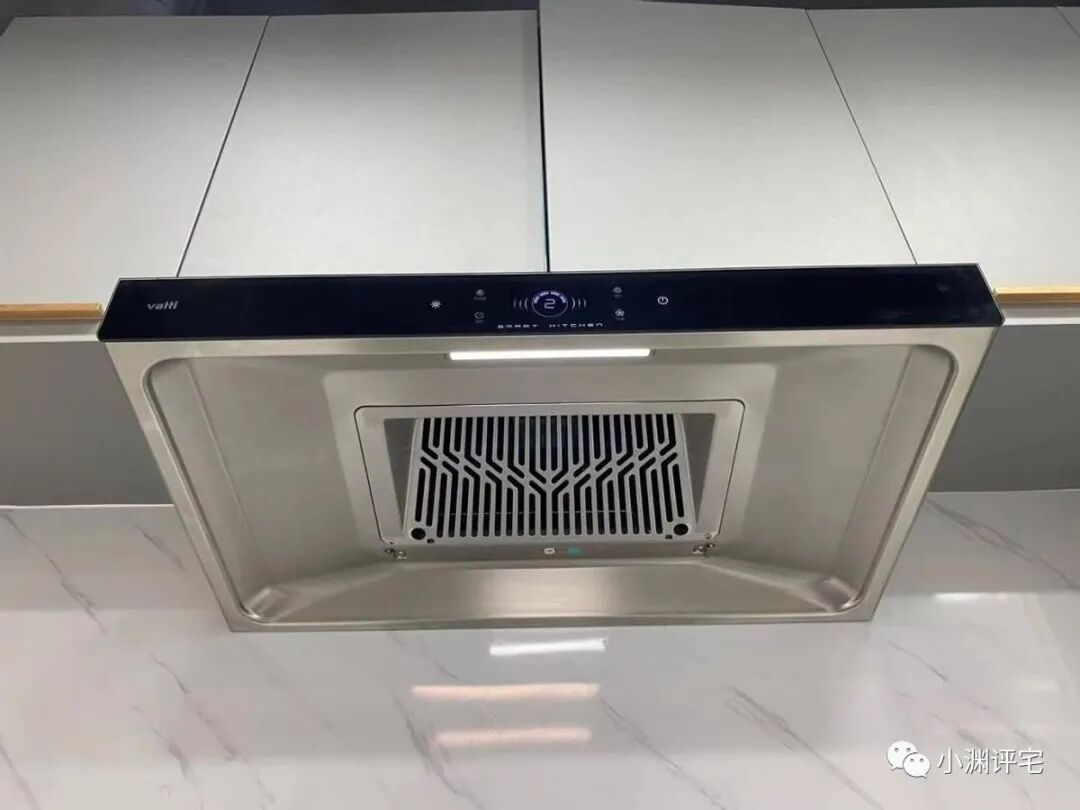侧面进气口,可以在油烟扩散前把油烟吸进去。那些上升速度太快的高温油烟,则交给顶部进气口负责。外形上,顶侧双吸式油烟机更像侧吸。但侧吸的面板是一个斜面,而顶侧双吸通常把侧面做成了垂直的,整体上更显小巧。