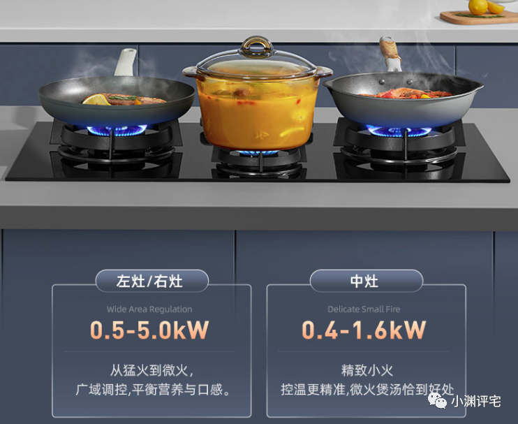 以三眼燃气灶为例,它中间那个小灶眼的功率会比两侧低很多。如下图,两侧都是5.0kW,中间只有1.6kW——1.6kW是什么概念?把5.0kW的灶眼火力调到最小,差不多就是1.6kW。