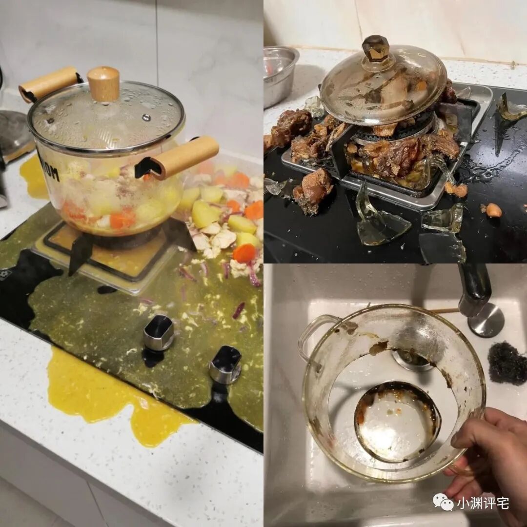 玻璃锅更像是个餐具而不是锅,最大卖点也是“能当餐具”。从燃气灶上端下来,直接就能放在餐桌上。但使用过程中,会出现一些问题:
