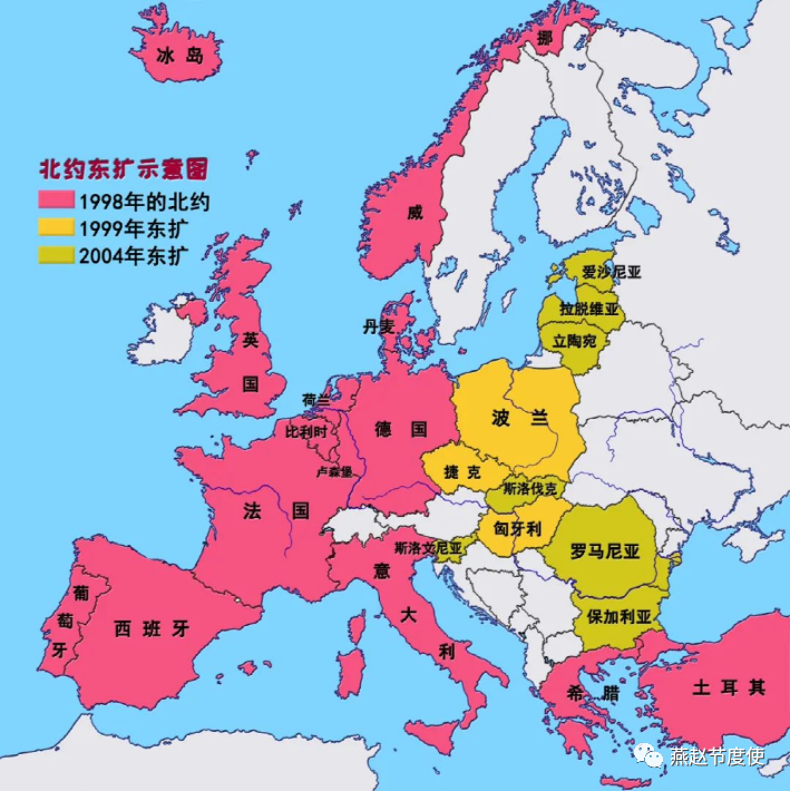 美欧放弃此前向俄罗斯保证的北约不东扩的承诺,大肆吸收东欧新成员国。