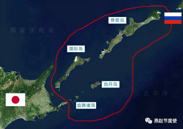 北方四岛俄罗斯命名为:库纳施尔岛、伊图鲁普岛、赫巴马伊群岛、施科坦岛,日本命名为:国后岛、择捉岛、齿舞群岛、色丹岛,总面积为5038.33平方米。原属日本,二战末期被苏联占领,苏联解体后归属俄罗斯。