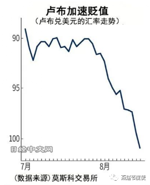 8月14日,卢布兑美元汇率跌破1:100。后来几天虽然俄罗斯央行采取措施让卢布汇率回升到了1:95。