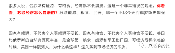 按照作者的思路,虽然俄罗斯资源丰富,但在“市场经济”的运作下,俄罗斯人依然会加不起油,烧不起气,吃不起饭,依然会跟美国1929年的大萧条一样,人民大面积失业,许多人吃不起饭,流落街头,最终国家崩溃。