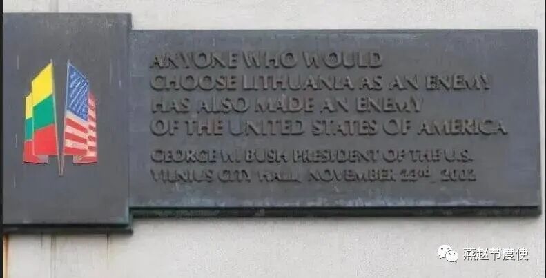 立陶宛首都维尔纽斯市政厅的外墙上写着美国前总统小布什的一句话:谁侵犯立陶宛,谁就是美国军队的敌人。