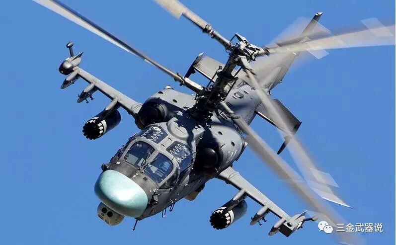KA52武装直升机绰号短吻鳄,是俄罗斯直升机公司建造的,是一款双旋翼、涡轴发动机、并列双座位的武装直升机。