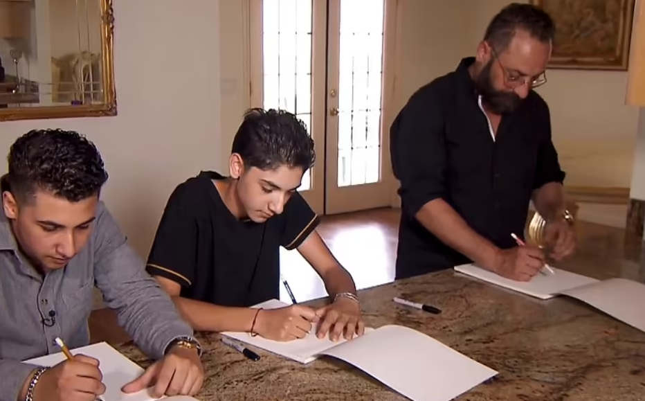 在媒体相机的包围下,一家人坐在厨房岛台前,被要求画出他们所回忆的东西。