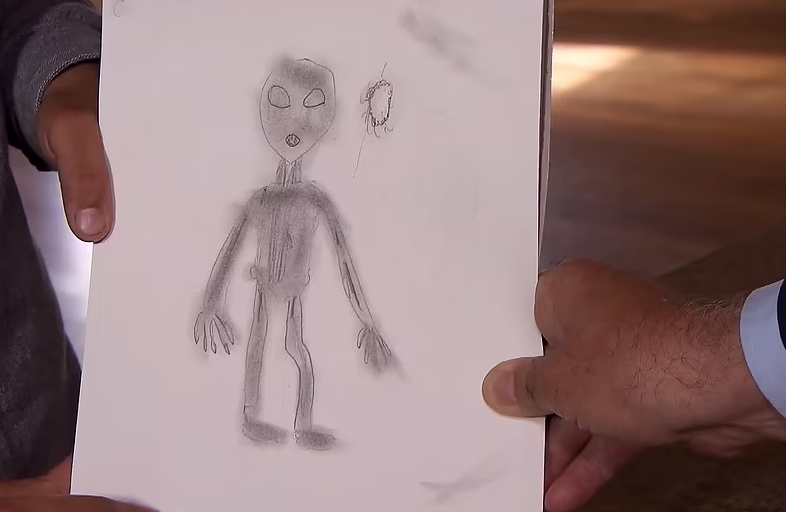 谈到外星人的外貌,男孩说:“他的脚看起来很奇怪,脸很大,眼睛很大,你可以看到一张大嘴。我能听到他响亮的深呼吸声,看到他的胃在动。