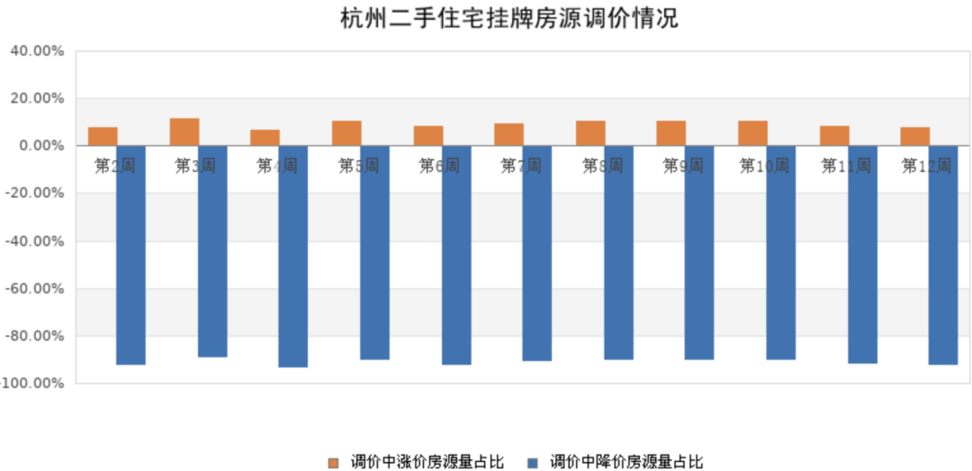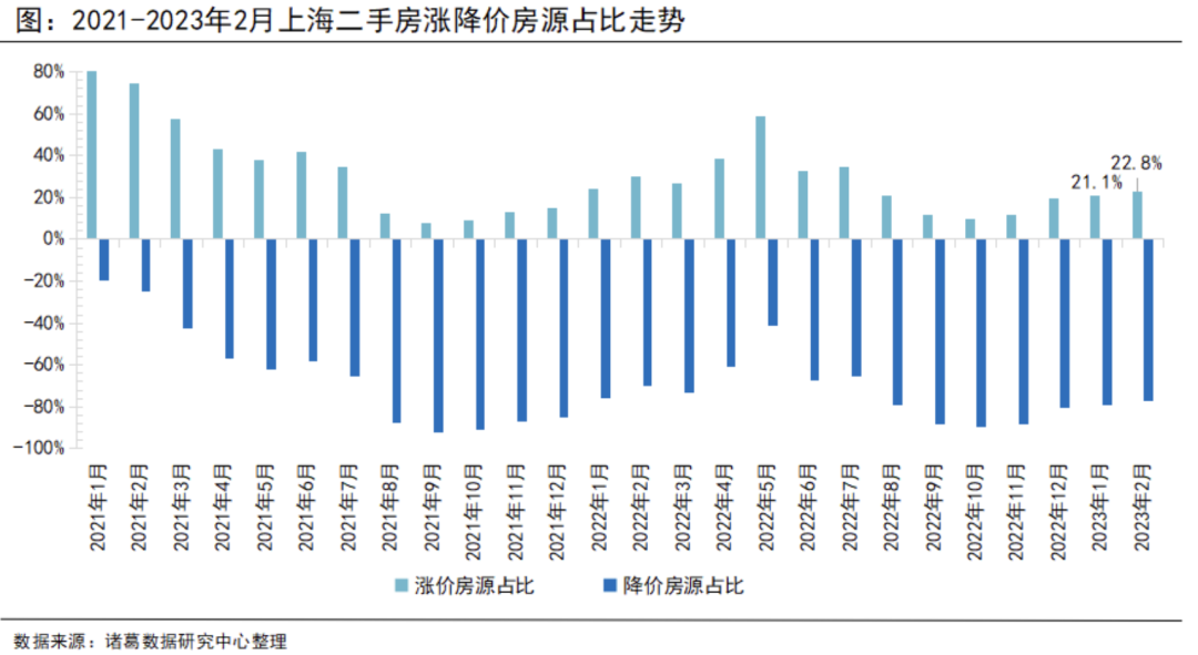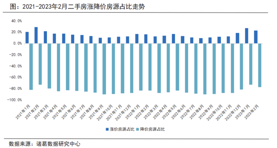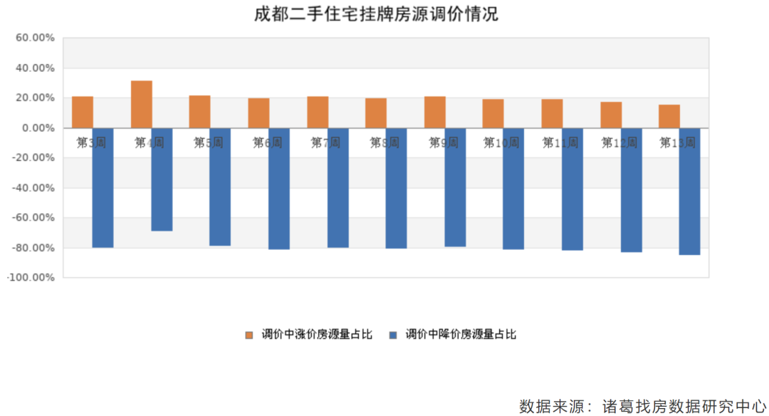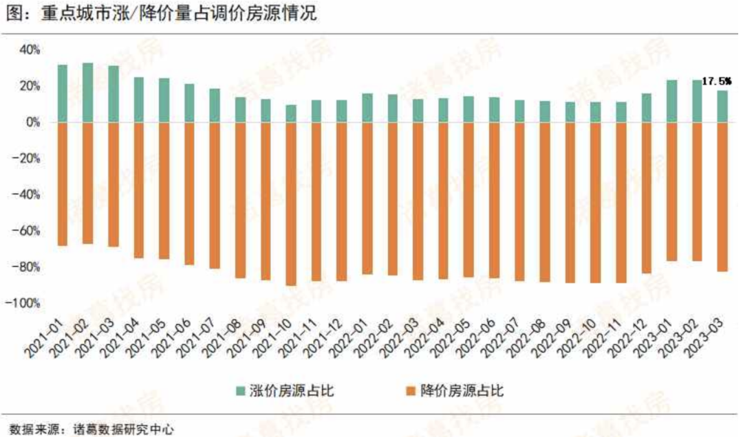 以诸葛找房研究中心披露的数据来看,整体来看,热点城市目前二手房挂牌量当中,涨价房源只占17.5%,降价房源则超过了80%。
