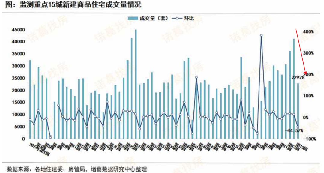 诸葛找房公布的最新一周新房和二手房成交数据,重点15城总成交量都出现了跳水。