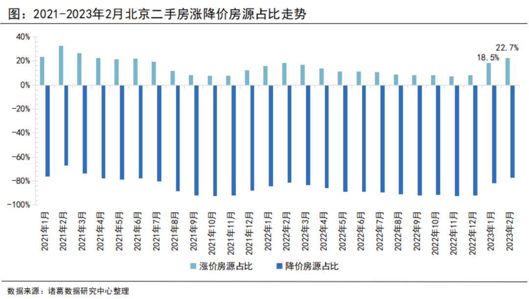 其他热点城市,大体也是如此。北京目前二手房涨价房源占比22.7%,降价房源占比77.3%。