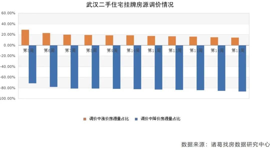其中武汉的二手房挂牌量降价房源同样超过80%。