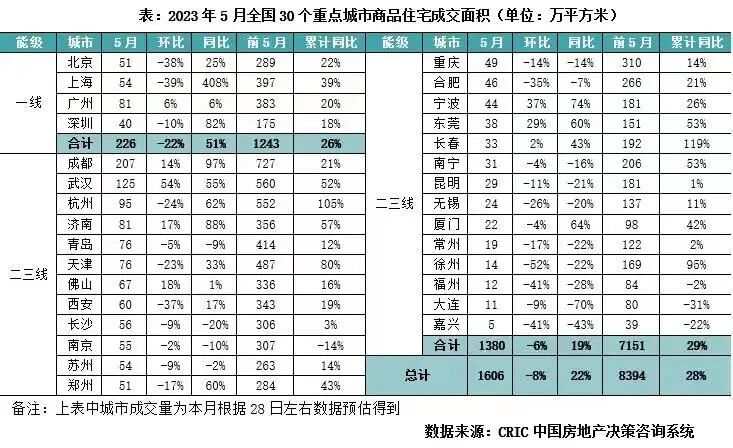 克而瑞披露,30个重点城市新房成交面积1606万平方米,滑落至2月份的水平,与四月份相比下降了8%。