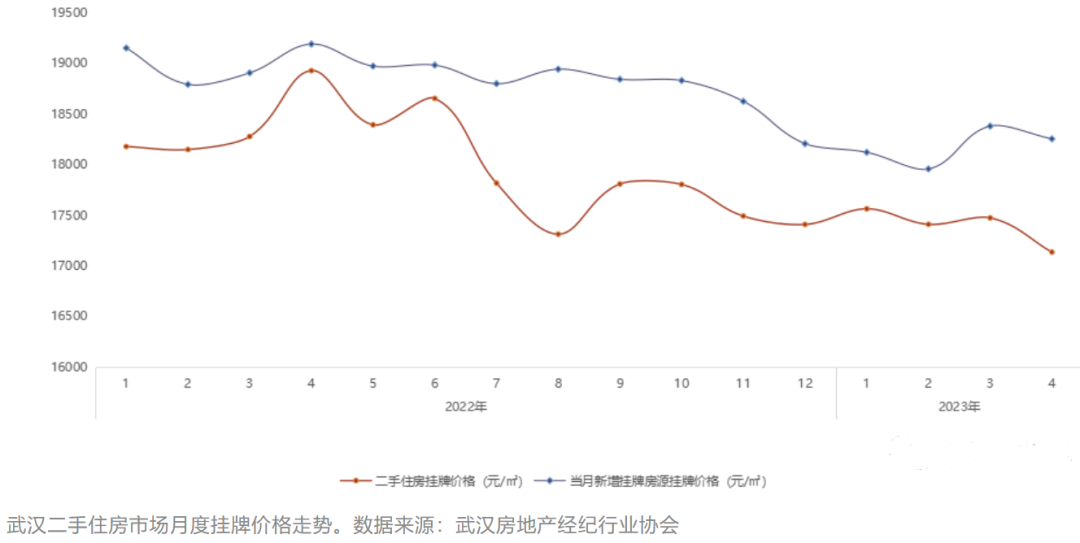 2023年4月,武汉二手住宅总体挂牌价格为17136.88元/平方米,较2023年3月下跌1.93%,较去年同期跌9.47%。其中新增房源挂牌价格18254.91元/平方米,较2023年3月份下跌0.68%,较去年同期跌4.88%。