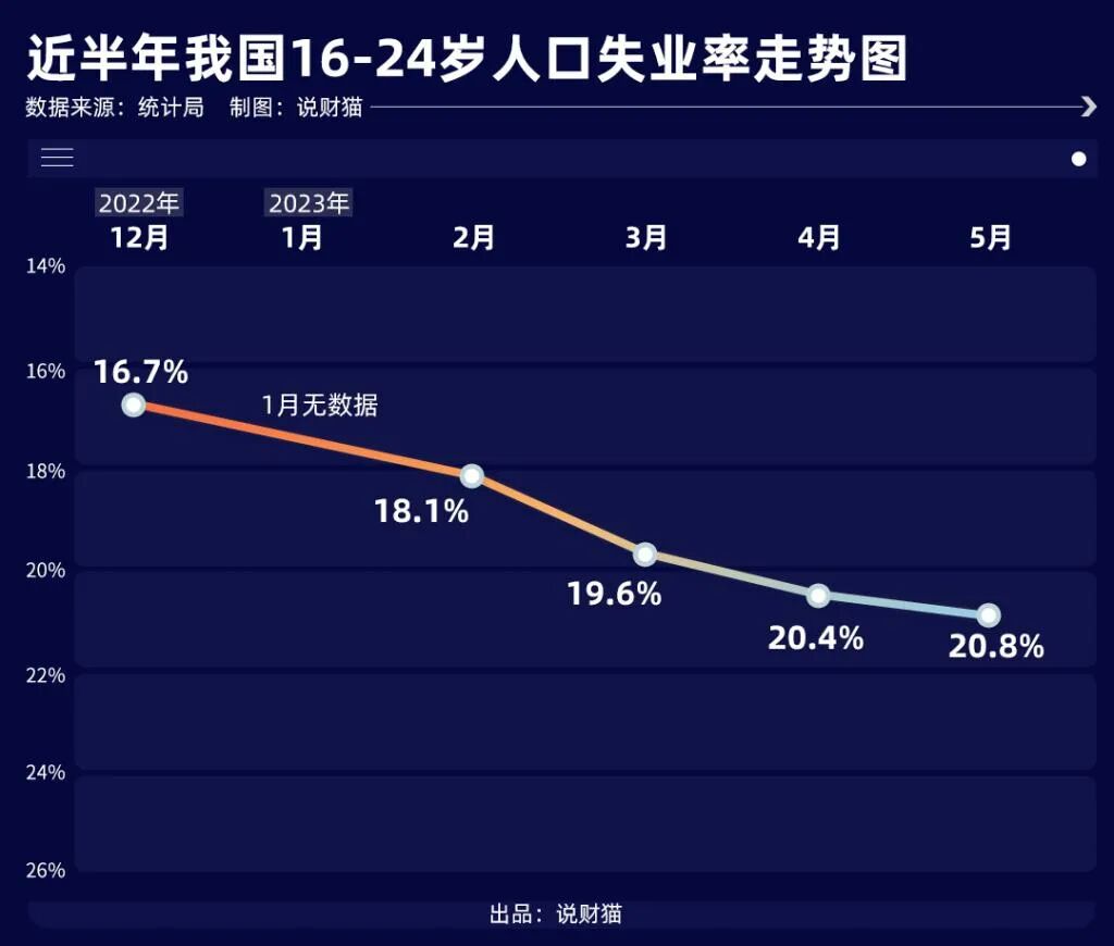 经济表现方面,只看一个关键数据就行了,失业率。一路上行,5月份16至24岁人口的失业率高达20.8%,继续刷新天际线。