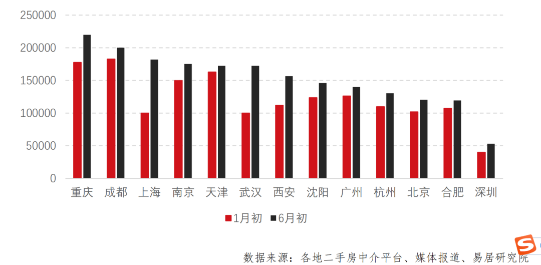 第二,从当下挂牌规模来看,,重庆、成都和上海的二手房挂牌量规模相对大,6月初分别为22、20和18万套。