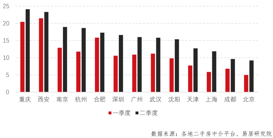 易居研究院披露的13个城市去化周期,无一例外,二季度都比一季度延长了不少。其中上海、北京的二手房去化周期几乎翻倍。南京、杭州、武汉、沈阳、深圳、广州、天津、成都的去化周期增速都非常大。