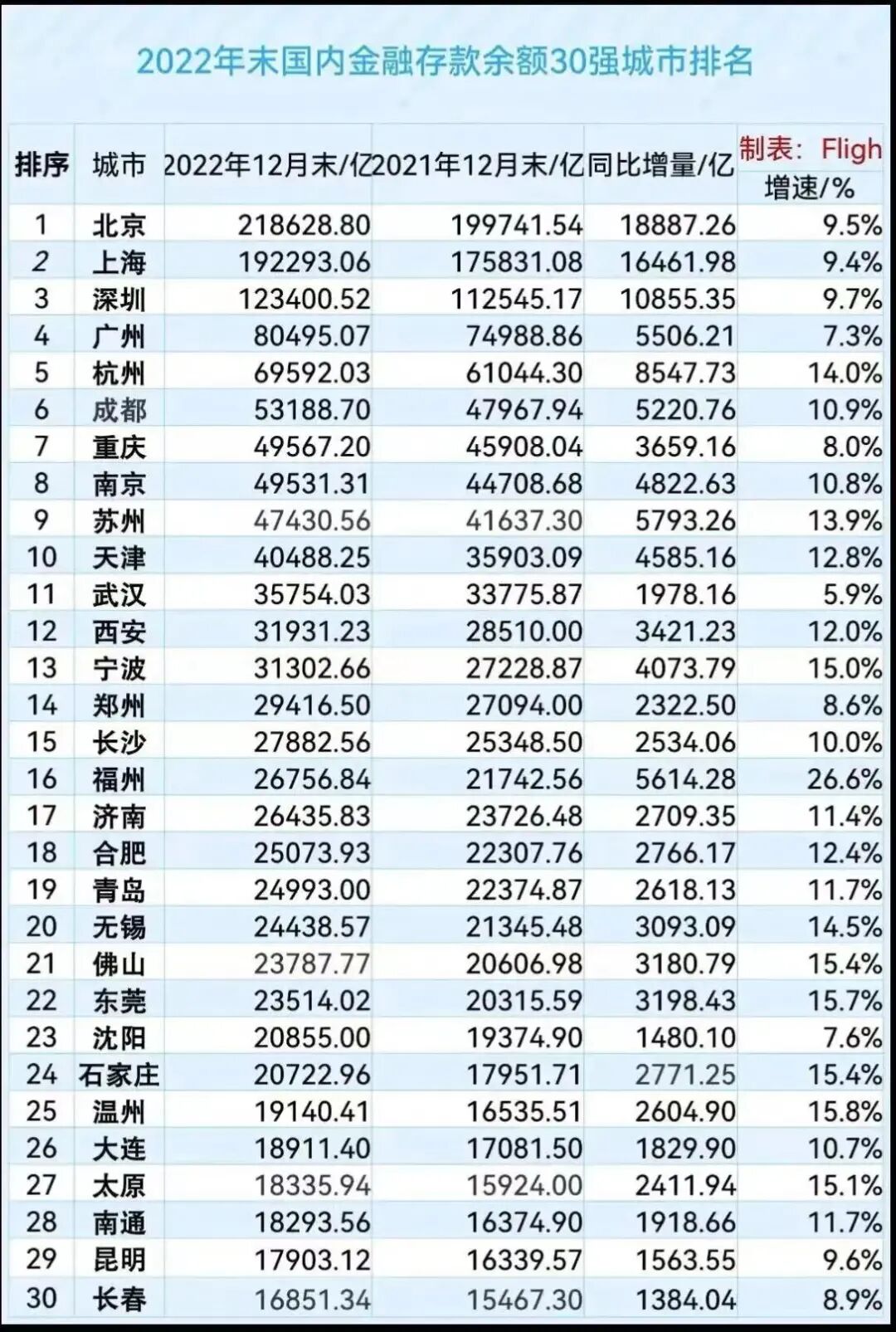 杭州的资金总量(金融机构本外币存款余额)6.96万亿,远高于武汉,也高出成都不少,在全国排名中,仅次于北京、上海、深圳、广州。