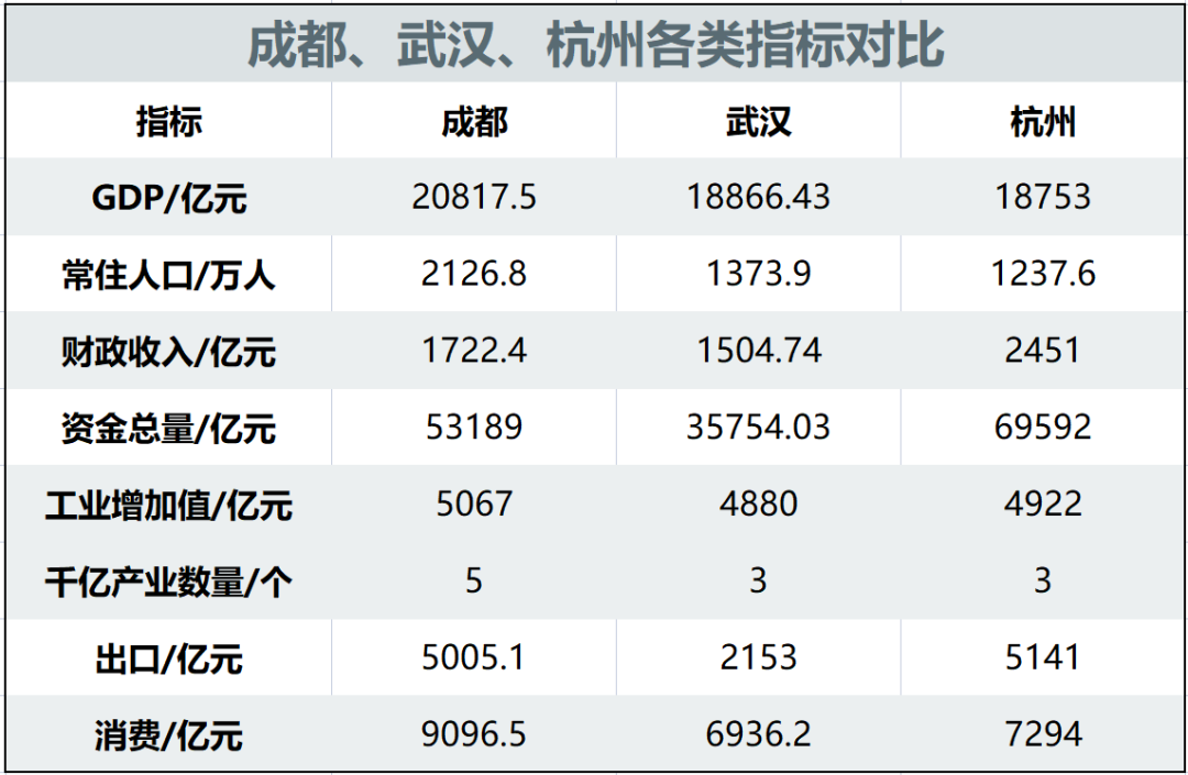从城市气质来看,三座城市也不尽相同,成都主打的是消费,武汉主打的是工业,杭州主打的是互联网。