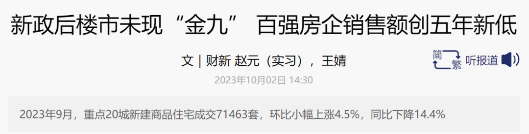 新政后楼市未现“金九”,百强房企销售金额创五年新低。