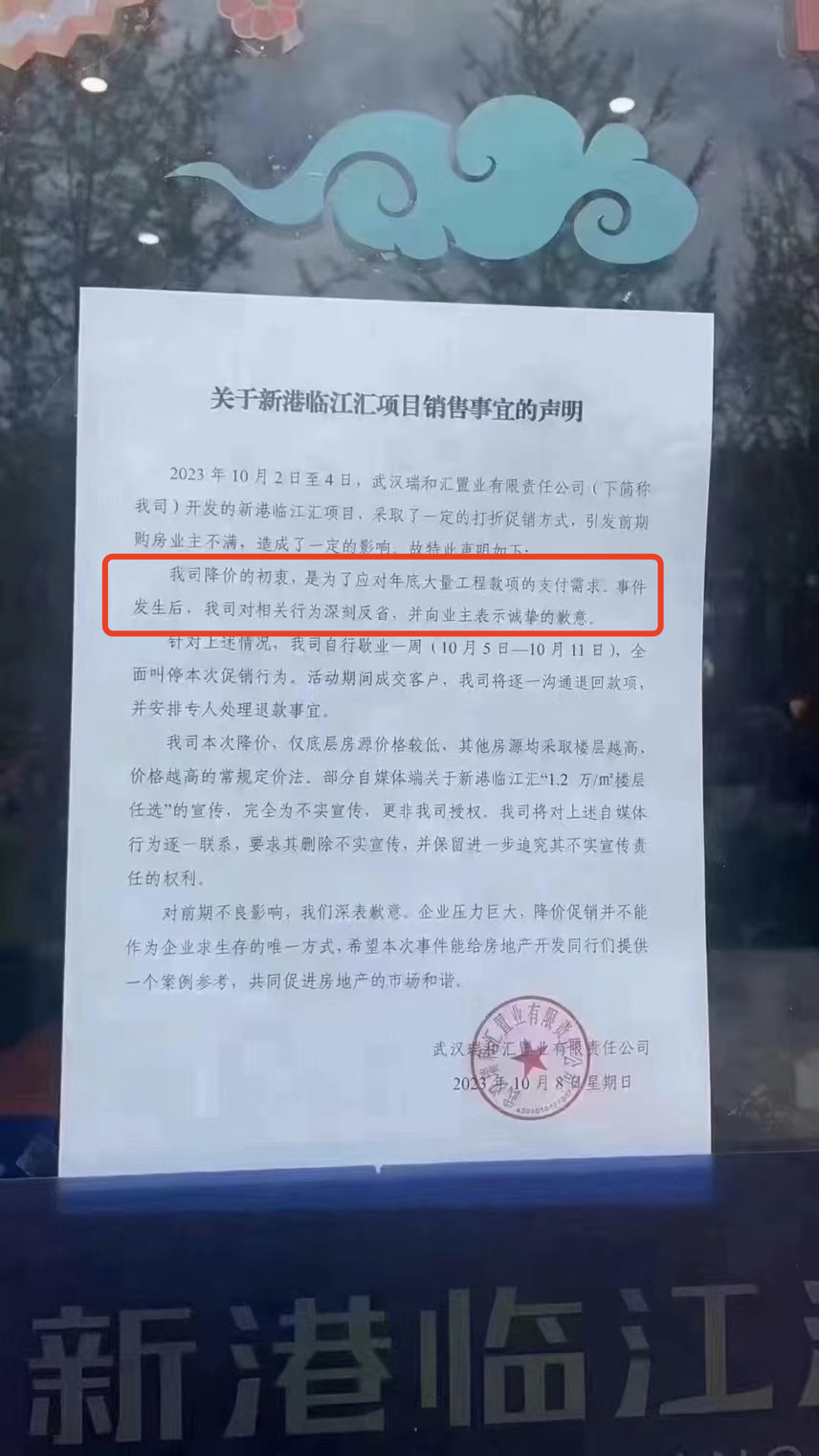 新港临江汇在封盘后也发布了一份说明,解释了为何降价: