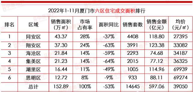 其中,岛外部分区域市场调整压力较大,翔安区、集美区销售面积同比下降均超六成。