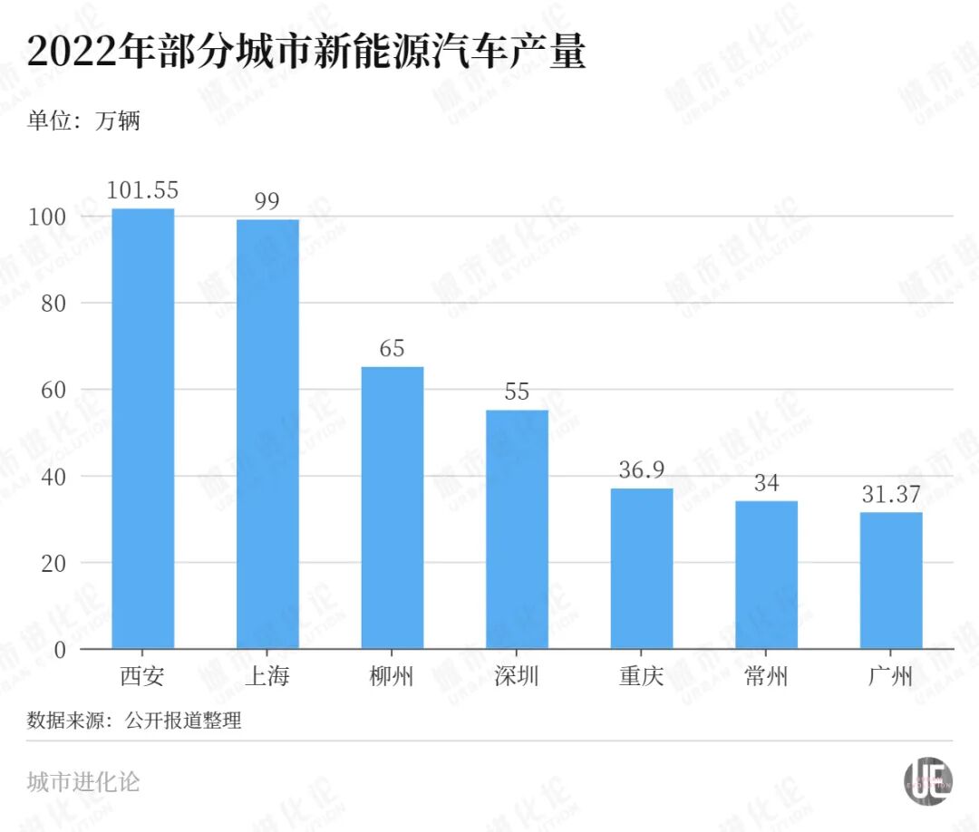 2022年,西安凭借比亚迪大卖成功逆袭,超越了上海,坐上了新能源汽车产量第一城宝座。同时,常州凭借理想、北汽和东风日产的生产,也跻身前十。