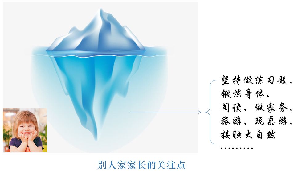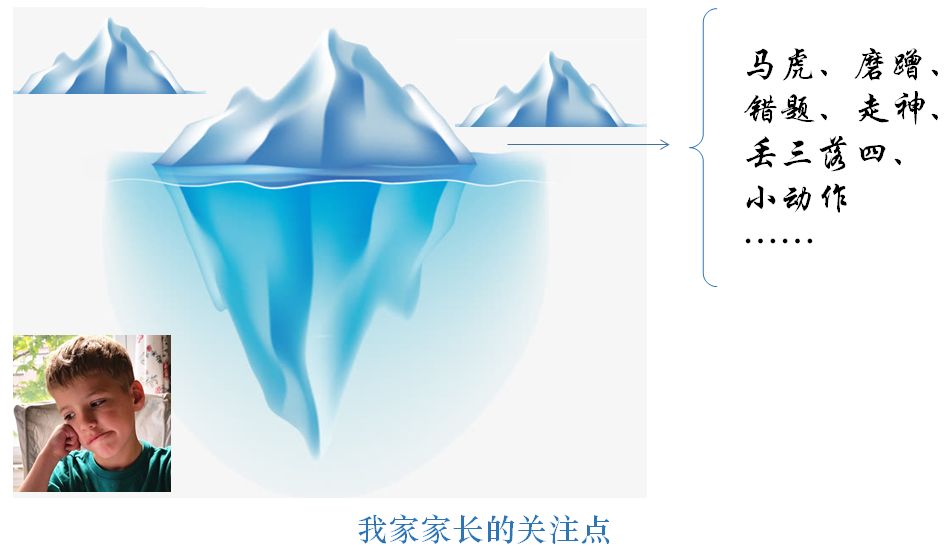 冰山模型是个有用的模型。想象一下,孩子表现出来的各种问题是冰山露出的部分,原因是水下的部分。我们是不是对孩子的所有批评训斥,说的都是水面以上的?“别揉眼睛!快点写完!下次不许再错了!不许哭!作业再潦草就撕了……”