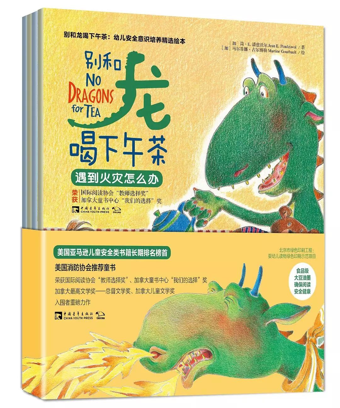 这套绘本全称《别和龙喝下午茶:幼儿安全意识培养精选绘本》,共分为四本,主题分别是:遇到火灾怎么办、被人欺负怎么办、遇到陌生人怎么办、水边玩耍要注意,都是生活中常见的危险情况。