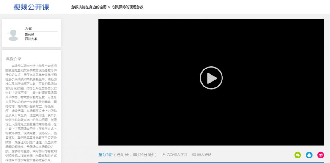 这是四川大学开设的一门公开课,共5个课时,分别介绍了心脏骤停的现场抢救、气道异物梗阻的急救、创伤的止血、包扎和固定、蛇咬伤、电击伤、溺水现场急救、危险现场的救护与逃离,实用性和可操作性都非常的强,其中第二集的气道异物梗阻是孩子较为容易遇到的情况。