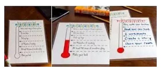 我们可以教孩子画好玩的计划表,在计划旁边画一个温度计,每完成一项任务,就填充一点点,当任务全部完成后,温度计也填满了,这样会让孩子很有成就感。