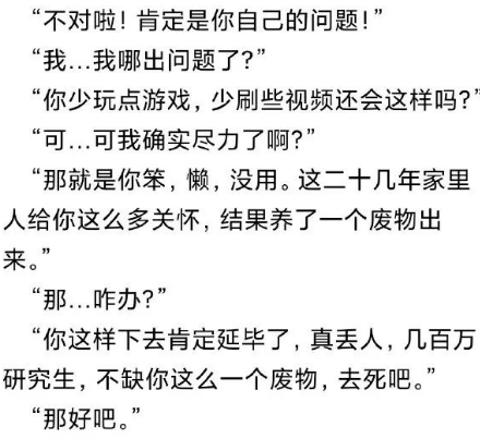 最终,他归结为,自己是个废物。难以接受自己的无能,于是心灰意冷,选择离开人世。