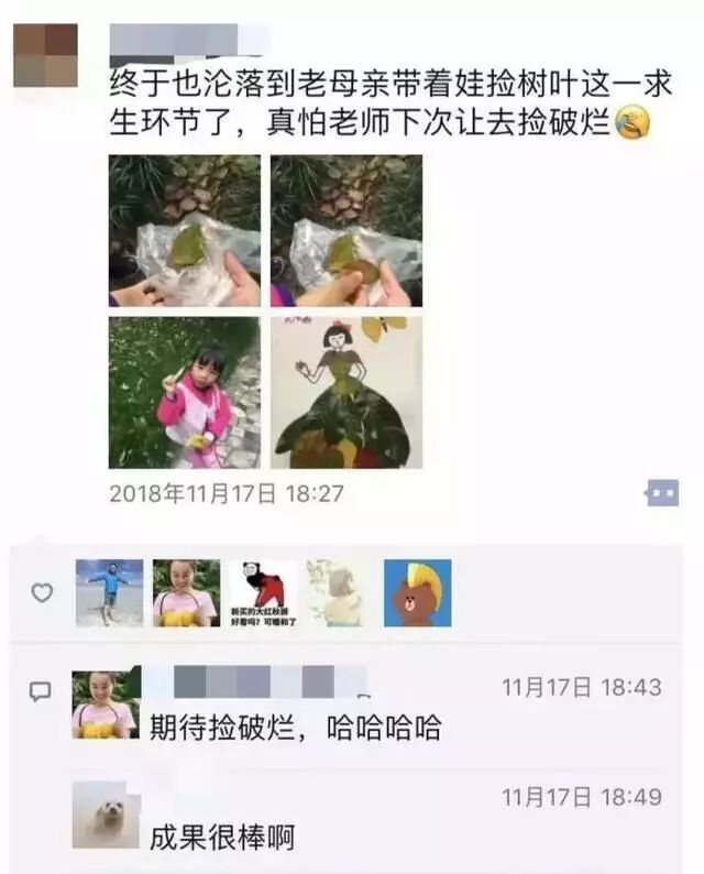 结果开学后,发现别人家孩子带的都是各种树叶拼成的小动物图案,树叶还基本没有本地的,就我家孩子拿了几个光秃秃的树叶......」