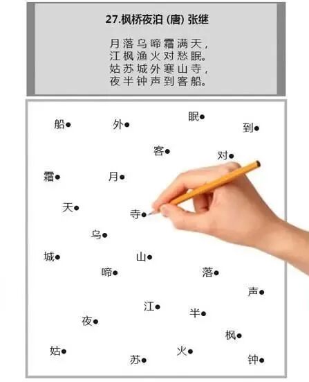 这个方法更适合有一定识字基础,或者已经学习了一些诗歌的孩子。如下图所示,在上面提供对照的诗歌或者故事的段落,然后在纸上随机位置写下这些汉字,让孩子按照文字顺序将汉字旁边的黑点连成一条线。