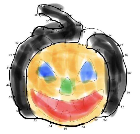 这张是1-90的数字连线图,画完是个南瓜,孩子连线后还用彩笔上色了。