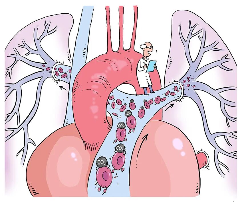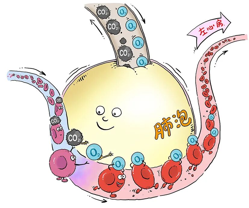 到达肺泡内,我们卸下背了一路的二氧化碳,重新带上氧气包裹准备再次出发,此时,血液就变成了动脉血,流向左心房。