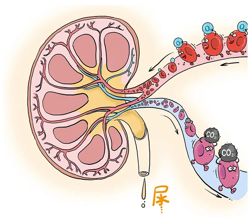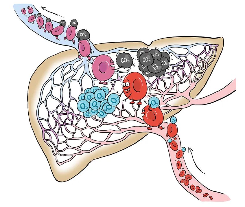 比如,动脉血进入肝、肾等组织器官毛细血管,卸下满是氧气的包裹,同时从这些器官“取件”,带走二氧化碳。