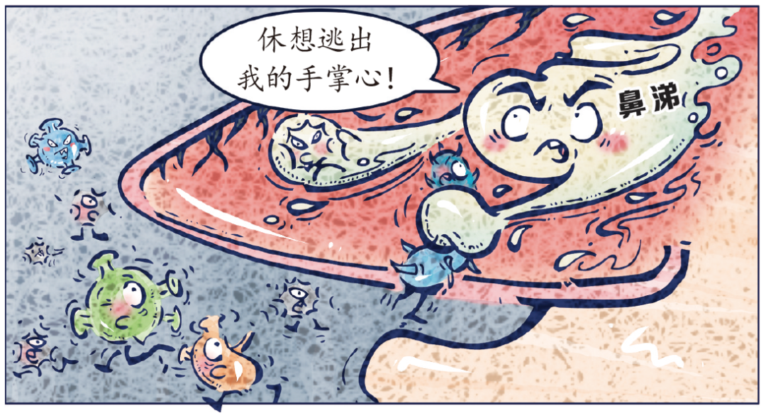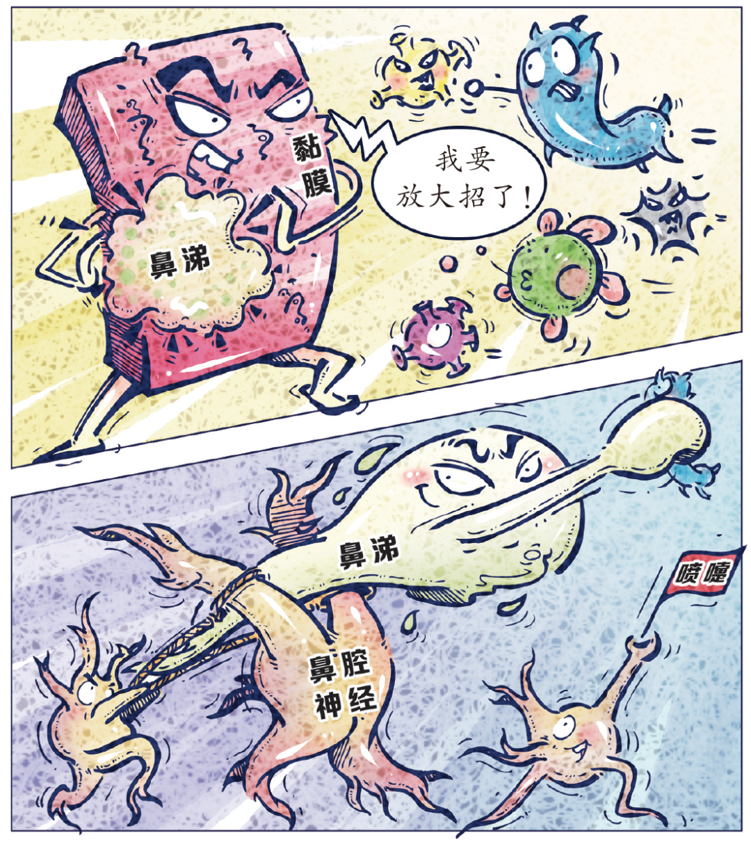 当致病微生物过多时,鼻黏膜意识到有危险,便会逐渐充血,分泌出更多的鼻涕,用来困住敌人。鼻腔神经也拉响警报,开始蓄力,准备通过喷嚏把包裹着敌人的鼻涕“发射”到体外。