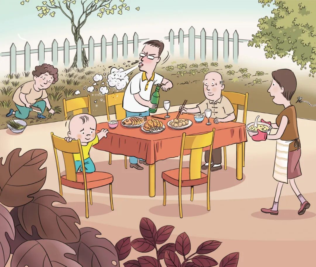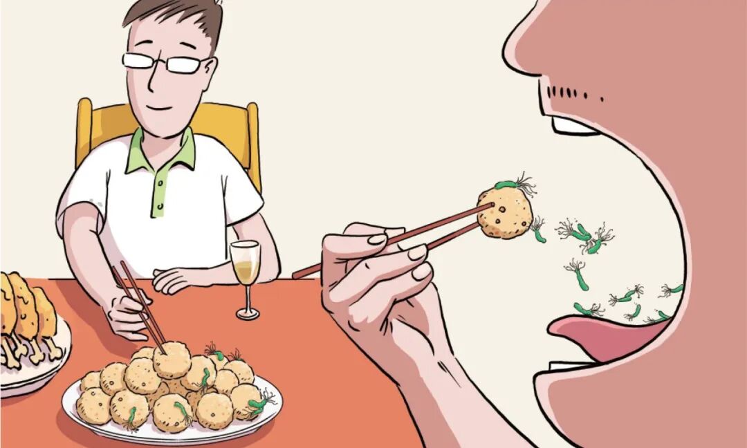 爷爷是幽门螺杆菌感染者,缺少使用公筷的健康意识,手中筷子碰过的几道菜里,沾了不少幽门螺杆菌,随时可能感染家人。
